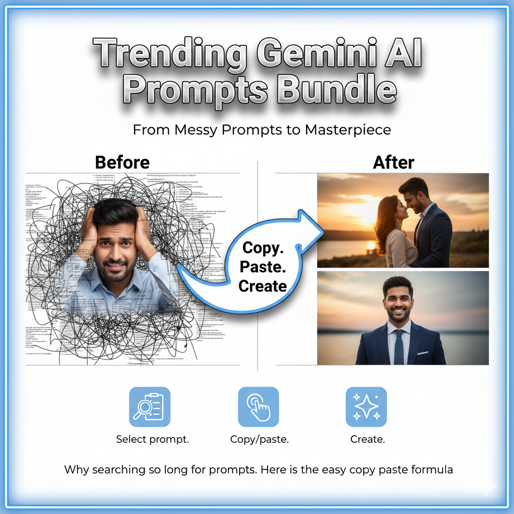 Are you tired of boring, repetitive photos that don’t stand out? With the Ultimate Gemini Prompts Bundle, you’ll get professionally crafted AI prompts that instantly transform your pictures into aesthetic, cinematic, and viral-worthy shots.