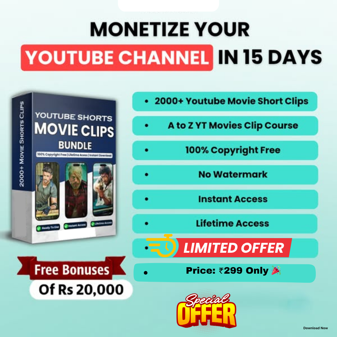 Ab milta hai ek Ready-to-Use Digital Bundle 👉 2000+ Movie Shorts Clips + Full Viral YouTube Course Jisse aap Day 1 se kamaana start kar sakte ho! 💸